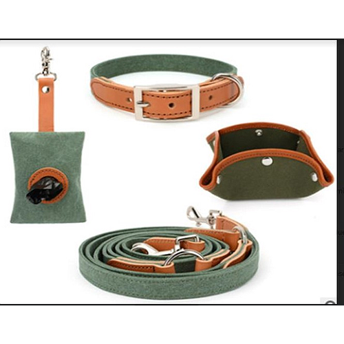 Canvas, leather head Collar L+ single head traction + folding bowl + poop picking bag (green)- A2012(L)